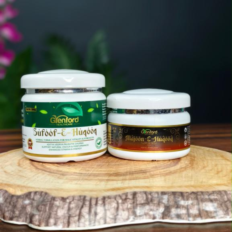 A strength-focused Unani pack featuring larger majoon with herbal oil and safoof for stamina and traditional support.